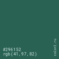 Цвет #296152 в цветовой модели RGB обозначается тремя октетами (41, 97, 82) в десятичном формате и #296152 в шестнадцатиричном (hex) формате, которые являются интенсивностью красного 41 (hex 29), интенсивность зелёного 97 (hex 61) и интенсивность синего 82 (hex 52).