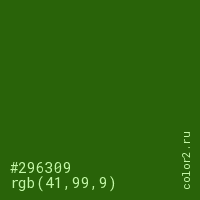 Цвет #296309 в цветовой модели RGB обозначается тремя октетами (41, 99, 9) в десятичном формате и #296309 в шестнадцатиричном (hex) формате, которые являются интенсивностью красного 41 (hex 29), интенсивность зелёного 99 (hex 63) и интенсивность синего 9 (hex 09).