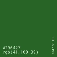 Цвет #296427 в цветовой модели RGB обозначается тремя октетами (41, 100, 39) в десятичном формате и #296427 в шестнадцатиричном (hex) формате, которые являются интенсивностью красного 41 (hex 29), интенсивность зелёного 100 (hex 64) и интенсивность синего 39 (hex 27).