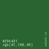 Цвет #296431 в цветовой модели RGB обозначается тремя октетами (41, 100, 49) в десятичном формате и #296431 в шестнадцатиричном (hex) формате, которые являются интенсивностью красного 41 (hex 29), интенсивность зелёного 100 (hex 64) и интенсивность синего 49 (hex 31).
