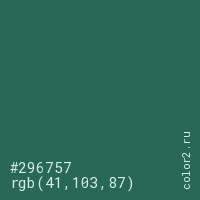 Цвет #296757 в цветовой модели RGB обозначается тремя октетами (41, 103, 87) в десятичном формате и #296757 в шестнадцатиричном (hex) формате, которые являются интенсивностью красного 41 (hex 29), интенсивность зелёного 103 (hex 67) и интенсивность синего 87 (hex 57).