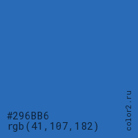 Цвет #296BB6 в цветовой модели RGB обозначается тремя октетами (41, 107, 182) в десятичном формате и #296BB6 в шестнадцатиричном (hex) формате, которые являются интенсивностью красного 41 (hex 29), интенсивность зелёного 107 (hex 6B) и интенсивность синего 182 (hex B6).