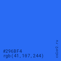 Цвет #296BF4 в цветовой модели RGB обозначается тремя октетами (41, 107, 244) в десятичном формате и #296BF4 в шестнадцатиричном (hex) формате, которые являются интенсивностью красного 41 (hex 29), интенсивность зелёного 107 (hex 6B) и интенсивность синего 244 (hex F4).
