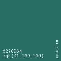 Цвет #296D64 в цветовой модели RGB обозначается тремя октетами (41, 109, 100) в десятичном формате и #296D64 в шестнадцатиричном (hex) формате, которые являются интенсивностью красного 41 (hex 29), интенсивность зелёного 109 (hex 6D) и интенсивность синего 100 (hex 64).