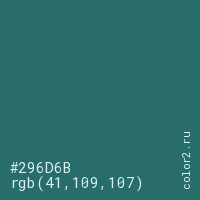 Цвет #296D6B в цветовой модели RGB обозначается тремя октетами (41, 109, 107) в десятичном формате и #296D6B в шестнадцатиричном (hex) формате, которые являются интенсивностью красного 41 (hex 29), интенсивность зелёного 109 (hex 6D) и интенсивность синего 107 (hex 6B).