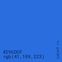 Цвет #296DDF в цветовой модели RGB обозначается тремя октетами (41, 109, 223) в десятичном формате и #296DDF в шестнадцатиричном (hex) формате, которые являются интенсивностью красного 41 (hex 29), интенсивность зелёного 109 (hex 6D) и интенсивность синего 223 (hex DF).