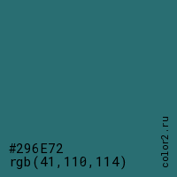 Цвет #296E72 в цветовой модели RGB обозначается тремя октетами (41, 110, 114) в десятичном формате и #296E72 в шестнадцатиричном (hex) формате, которые являются интенсивностью красного 41 (hex 29), интенсивность зелёного 110 (hex 6E) и интенсивность синего 114 (hex 72).