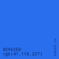 Цвет #296EED в цветовой модели RGB обозначается тремя октетами (41, 110, 237) в десятичном формате и #296EED в шестнадцатиричном (hex) формате, которые являются интенсивностью красного 41 (hex 29), интенсивность зелёного 110 (hex 6E) и интенсивность синего 237 (hex ED).