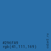 Цвет #296FA9 в цветовой модели RGB обозначается тремя октетами (41, 111, 169) в десятичном формате и #296FA9 в шестнадцатиричном (hex) формате, которые являются интенсивностью красного 41 (hex 29), интенсивность зелёного 111 (hex 6F) и интенсивность синего 169 (hex A9).