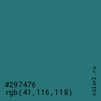 Цвет #297476 в цветовой модели RGB обозначается тремя октетами (41, 116, 118) в десятичном формате и #297476 в шестнадцатиричном (hex) формате, которые являются интенсивностью красного 41 (hex 29), интенсивность зелёного 116 (hex 74) и интенсивность синего 118 (hex 76).