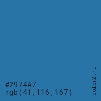 Цвет #2974A7 в цветовой модели RGB обозначается тремя октетами (41, 116, 167) в десятичном формате и #2974A7 в шестнадцатиричном (hex) формате, которые являются интенсивностью красного 41 (hex 29), интенсивность зелёного 116 (hex 74) и интенсивность синего 167 (hex A7).