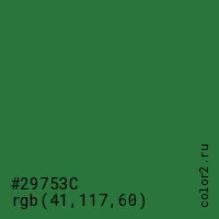 Цвет #29753C в цветовой модели RGB обозначается тремя октетами (41, 117, 60) в десятичном формате и #29753C в шестнадцатиричном (hex) формате, которые являются интенсивностью красного 41 (hex 29), интенсивность зелёного 117 (hex 75) и интенсивность синего 60 (hex 3C).