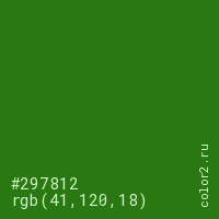 Цвет #297812 в цветовой модели RGB обозначается тремя октетами (41, 120, 18) в десятичном формате и #297812 в шестнадцатиричном (hex) формате, которые являются интенсивностью красного 41 (hex 29), интенсивность зелёного 120 (hex 78) и интенсивность синего 18 (hex 12).