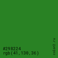 Цвет #298224 в цветовой модели RGB обозначается тремя октетами (41, 130, 36) в десятичном формате и #298224 в шестнадцатиричном (hex) формате, которые являются интенсивностью красного 41 (hex 29), интенсивность зелёного 130 (hex 82) и интенсивность синего 36 (hex 24).