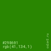 Цвет #298601 в цветовой модели RGB обозначается тремя октетами (41, 134, 1) в десятичном формате и #298601 в шестнадцатиричном (hex) формате, которые являются интенсивностью красного 41 (hex 29), интенсивность зелёного 134 (hex 86) и интенсивность синего 1 (hex 01).