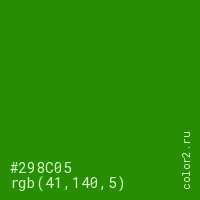 Цвет #298C05 в цветовой модели RGB обозначается тремя октетами (41, 140, 5) в десятичном формате и #298C05 в шестнадцатиричном (hex) формате, которые являются интенсивностью красного 41 (hex 29), интенсивность зелёного 140 (hex 8C) и интенсивность синего 5 (hex 05).