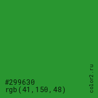 Цвет #299630 в цветовой модели RGB обозначается тремя октетами (41, 150, 48) в десятичном формате и #299630 в шестнадцатиричном (hex) формате, которые являются интенсивностью красного 41 (hex 29), интенсивность зелёного 150 (hex 96) и интенсивность синего 48 (hex 30).
