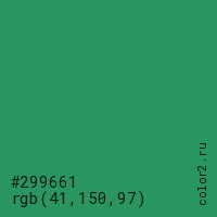 Цвет #299661 в цветовой модели RGB обозначается тремя октетами (41, 150, 97) в десятичном формате и #299661 в шестнадцатиричном (hex) формате, которые являются интенсивностью красного 41 (hex 29), интенсивность зелёного 150 (hex 96) и интенсивность синего 97 (hex 61).