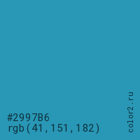 Цвет #2997B6 в цветовой модели RGB обозначается тремя октетами (41, 151, 182) в десятичном формате и #2997B6 в шестнадцатиричном (hex) формате, которые являются интенсивностью красного 41 (hex 29), интенсивность зелёного 151 (hex 97) и интенсивность синего 182 (hex B6).