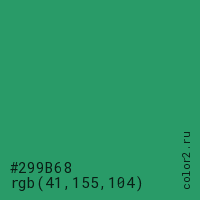 Цвет #299B68 в цветовой модели RGB обозначается тремя октетами (41, 155, 104) в десятичном формате и #299B68 в шестнадцатиричном (hex) формате, которые являются интенсивностью красного 41 (hex 29), интенсивность зелёного 155 (hex 9B) и интенсивность синего 104 (hex 68).