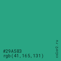 Цвет #29A583 в цветовой модели RGB обозначается тремя октетами (41, 165, 131) в десятичном формате и #29A583 в шестнадцатиричном (hex) формате, которые являются интенсивностью красного 41 (hex 29), интенсивность зелёного 165 (hex A5) и интенсивность синего 131 (hex 83).