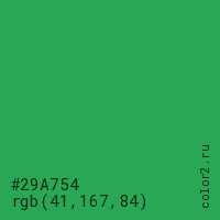 Цвет #29A754 в цветовой модели RGB обозначается тремя октетами (41, 167, 84) в десятичном формате и #29A754 в шестнадцатиричном (hex) формате, которые являются интенсивностью красного 41 (hex 29), интенсивность зелёного 167 (hex A7) и интенсивность синего 84 (hex 54).