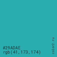 Цвет #29ADAE в цветовой модели RGB обозначается тремя октетами (41, 173, 174) в десятичном формате и #29ADAE в шестнадцатиричном (hex) формате, которые являются интенсивностью красного 41 (hex 29), интенсивность зелёного 173 (hex AD) и интенсивность синего 174 (hex AE).