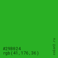 Цвет #29B024 в цветовой модели RGB обозначается тремя октетами (41, 176, 36) в десятичном формате и #29B024 в шестнадцатиричном (hex) формате, которые являются интенсивностью красного 41 (hex 29), интенсивность зелёного 176 (hex B0) и интенсивность синего 36 (hex 24).