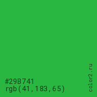 Цвет #29B741 в цветовой модели RGB обозначается тремя октетами (41, 183, 65) в десятичном формате и #29B741 в шестнадцатиричном (hex) формате, которые являются интенсивностью красного 41 (hex 29), интенсивность зелёного 183 (hex B7) и интенсивность синего 65 (hex 41).