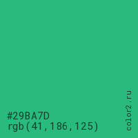 Цвет #29BA7D в цветовой модели RGB обозначается тремя октетами (41, 186, 125) в десятичном формате и #29BA7D в шестнадцатиричном (hex) формате, которые являются интенсивностью красного 41 (hex 29), интенсивность зелёного 186 (hex BA) и интенсивность синего 125 (hex 7D).