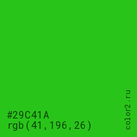 Цвет #29C41A в цветовой модели RGB обозначается тремя октетами (41, 196, 26) в десятичном формате и #29C41A в шестнадцатиричном (hex) формате, которые являются интенсивностью красного 41 (hex 29), интенсивность зелёного 196 (hex C4) и интенсивность синего 26 (hex 1A).