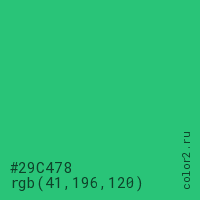 Цвет #29C478 в цветовой модели RGB обозначается тремя октетами (41, 196, 120) в десятичном формате и #29C478 в шестнадцатиричном (hex) формате, которые являются интенсивностью красного 41 (hex 29), интенсивность зелёного 196 (hex C4) и интенсивность синего 120 (hex 78).