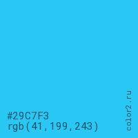 Цвет #29C7F3 в цветовой модели RGB обозначается тремя октетами (41, 199, 243) в десятичном формате и #29C7F3 в шестнадцатиричном (hex) формате, которые являются интенсивностью красного 41 (hex 29), интенсивность зелёного 199 (hex C7) и интенсивность синего 243 (hex F3).