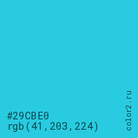Цвет #29CBE0 в цветовой модели RGB обозначается тремя октетами (41, 203, 224) в десятичном формате и #29CBE0 в шестнадцатиричном (hex) формате, которые являются интенсивностью красного 41 (hex 29), интенсивность зелёного 203 (hex CB) и интенсивность синего 224 (hex E0).
