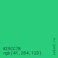 Цвет #29CC7B в цветовой модели RGB обозначается тремя октетами (41, 204, 123) в десятичном формате и #29CC7B в шестнадцатиричном (hex) формате, которые являются интенсивностью красного 41 (hex 29), интенсивность зелёного 204 (hex CC) и интенсивность синего 123 (hex 7B).