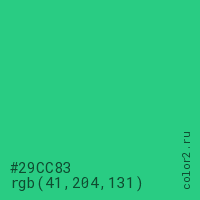 Цвет #29CC83 в цветовой модели RGB обозначается тремя октетами (41, 204, 131) в десятичном формате и #29CC83 в шестнадцатиричном (hex) формате, которые являются интенсивностью красного 41 (hex 29), интенсивность зелёного 204 (hex CC) и интенсивность синего 131 (hex 83).