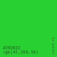 Цвет #29D032 в цветовой модели RGB обозначается тремя октетами (41, 208, 50) в десятичном формате и #29D032 в шестнадцатиричном (hex) формате, которые являются интенсивностью красного 41 (hex 29), интенсивность зелёного 208 (hex D0) и интенсивность синего 50 (hex 32).