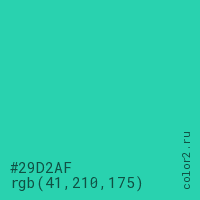Цвет #29D2AF в цветовой модели RGB обозначается тремя октетами (41, 210, 175) в десятичном формате и #29D2AF в шестнадцатиричном (hex) формате, которые являются интенсивностью красного 41 (hex 29), интенсивность зелёного 210 (hex D2) и интенсивность синего 175 (hex AF).