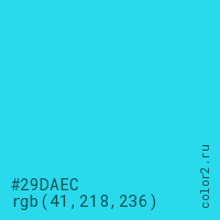 Цвет #29DAEC в цветовой модели RGB обозначается тремя октетами (41, 218, 236) в десятичном формате и #29DAEC в шестнадцатиричном (hex) формате, которые являются интенсивностью красного 41 (hex 29), интенсивность зелёного 218 (hex DA) и интенсивность синего 236 (hex EC).