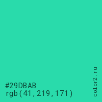 Цвет #29DBAB в цветовой модели RGB обозначается тремя октетами (41, 219, 171) в десятичном формате и #29DBAB в шестнадцатиричном (hex) формате, которые являются интенсивностью красного 41 (hex 29), интенсивность зелёного 219 (hex DB) и интенсивность синего 171 (hex AB).