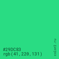 Цвет #29DC83 в цветовой модели RGB обозначается тремя октетами (41, 220, 131) в десятичном формате и #29DC83 в шестнадцатиричном (hex) формате, которые являются интенсивностью красного 41 (hex 29), интенсивность зелёного 220 (hex DC) и интенсивность синего 131 (hex 83).