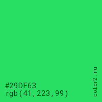 Цвет #29DF63 в цветовой модели RGB обозначается тремя октетами (41, 223, 99) в десятичном формате и #29DF63 в шестнадцатиричном (hex) формате, которые являются интенсивностью красного 41 (hex 29), интенсивность зелёного 223 (hex DF) и интенсивность синего 99 (hex 63).