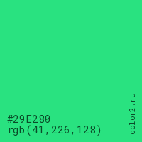 Цвет #29E280 в цветовой модели RGB обозначается тремя октетами (41, 226, 128) в десятичном формате и #29E280 в шестнадцатиричном (hex) формате, которые являются интенсивностью красного 41 (hex 29), интенсивность зелёного 226 (hex E2) и интенсивность синего 128 (hex 80).