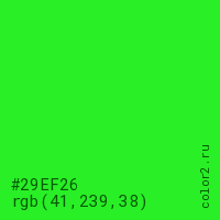 Цвет #29EF26 в цветовой модели RGB обозначается тремя октетами (41, 239, 38) в десятичном формате и #29EF26 в шестнадцатиричном (hex) формате, которые являются интенсивностью красного 41 (hex 29), интенсивность зелёного 239 (hex EF) и интенсивность синего 38 (hex 26).