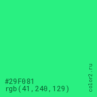 Цвет #29F081 в цветовой модели RGB обозначается тремя октетами (41, 240, 129) в десятичном формате и #29F081 в шестнадцатиричном (hex) формате, которые являются интенсивностью красного 41 (hex 29), интенсивность зелёного 240 (hex F0) и интенсивность синего 129 (hex 81).