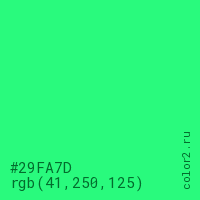 Цвет #29FA7D в цветовой модели RGB обозначается тремя октетами (41, 250, 125) в десятичном формате и #29FA7D в шестнадцатиричном (hex) формате, которые являются интенсивностью красного 41 (hex 29), интенсивность зелёного 250 (hex FA) и интенсивность синего 125 (hex 7D).