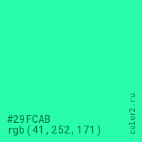 Цвет #29FCAB в цветовой модели RGB обозначается тремя октетами (41, 252, 171) в десятичном формате и #29FCAB в шестнадцатиричном (hex) формате, которые являются интенсивностью красного 41 (hex 29), интенсивность зелёного 252 (hex FC) и интенсивность синего 171 (hex AB).