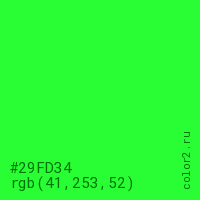 Цвет #29FD34 в цветовой модели RGB обозначается тремя октетами (41, 253, 52) в десятичном формате и #29FD34 в шестнадцатиричном (hex) формате, которые являются интенсивностью красного 41 (hex 29), интенсивность зелёного 253 (hex FD) и интенсивность синего 52 (hex 34).