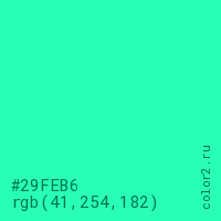 Цвет #29FEB6 в цветовой модели RGB обозначается тремя октетами (41, 254, 182) в десятичном формате и #29FEB6 в шестнадцатиричном (hex) формате, которые являются интенсивностью красного 41 (hex 29), интенсивность зелёного 254 (hex FE) и интенсивность синего 182 (hex B6).