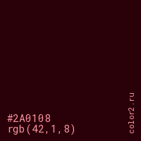 Цвет #2A0108 в цветовой модели RGB обозначается тремя октетами (42, 1, 8) в десятичном формате и #2A0108 в шестнадцатиричном (hex) формате, которые являются интенсивностью красного 42 (hex 2A), интенсивность зелёного 1 (hex 01) и интенсивность синего 8 (hex 08).